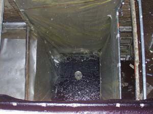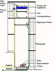 Um den natürlichen Niederschlagsverhältnissen möglichst nahe zu kommen, wurde ein Beregnungsturm konzipiert (Skizze rechts) und das Konzept schließlich in der Scheune der Familie Reinhold Will in Gießen-Lützellinden realisiert.